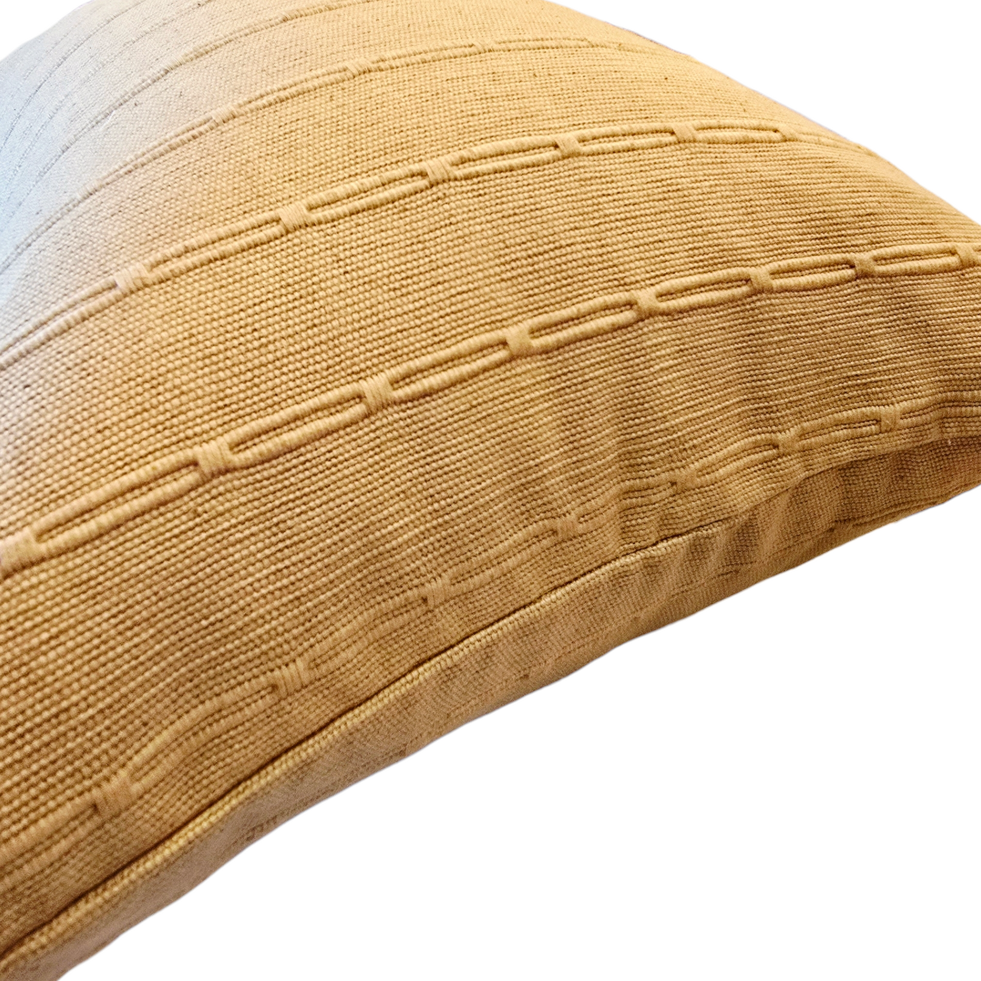 Yellow gold winner pillow. This pillow is a woven cotton pillow. The measurements are approximately 20x20". It is handmade from Chiang Mai, Thailand. It is an invisible zipper pillow and is backed with natural canvas. Each pillow will have variation because each is made by hand. The placement of the pattern will differ on each pillow!